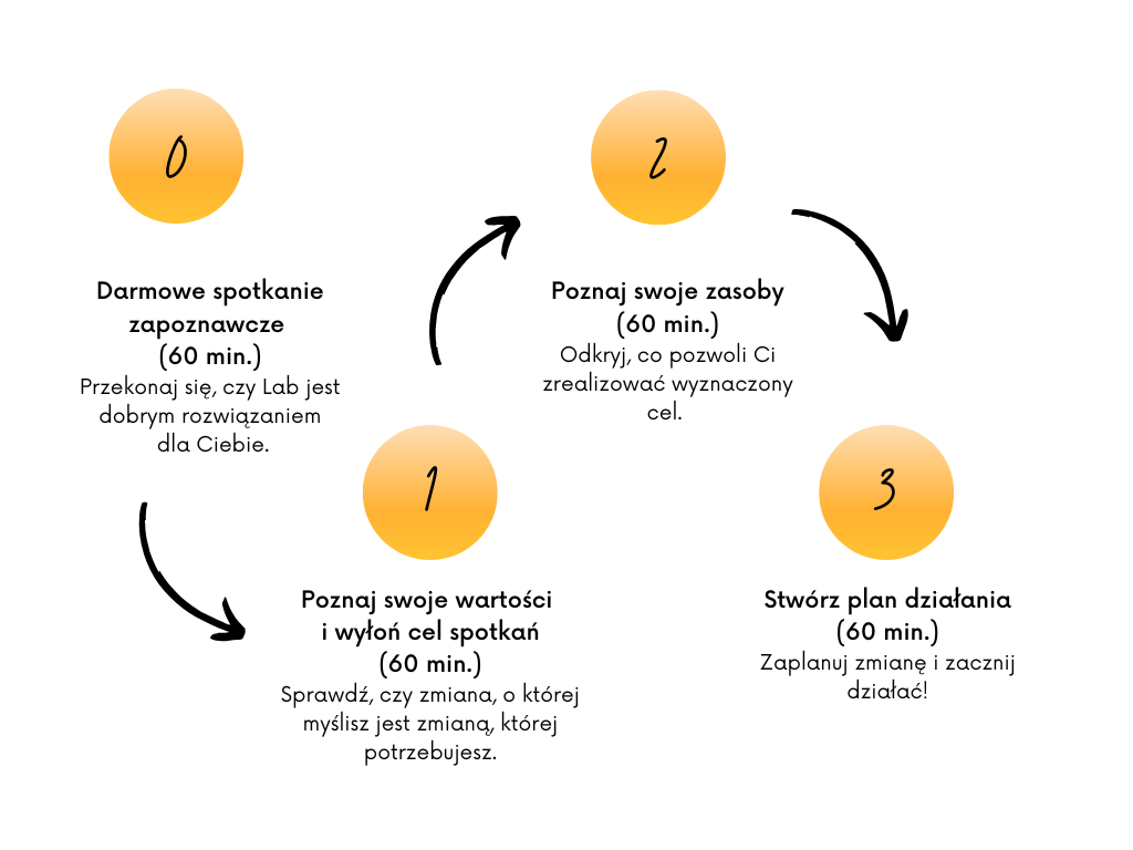 Lab to mały pakiet indywidualnych spotkań coachingowych, dzięki którym zaplanujesz swoją pierwszą wymarzoną zmianę. Wypróbuj ten pakiet, jeżeli chcesz postawić pierwszy krok na drodze do satysfakcjonującego życia na własnych warunkach, ale nie miałaś wcześniej do czynienia z coachingiem i nie jesteś pewna, czy taka forma współpracy będzie dla Ciebie odpowiednia.